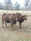 Brindle and red in color. Medium-sized cow with clean underside and good disposition.