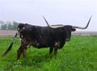 Beautiful brindle cow, Susie Q, has great conformation and nice lateral-growing horns that are starting to tip up.